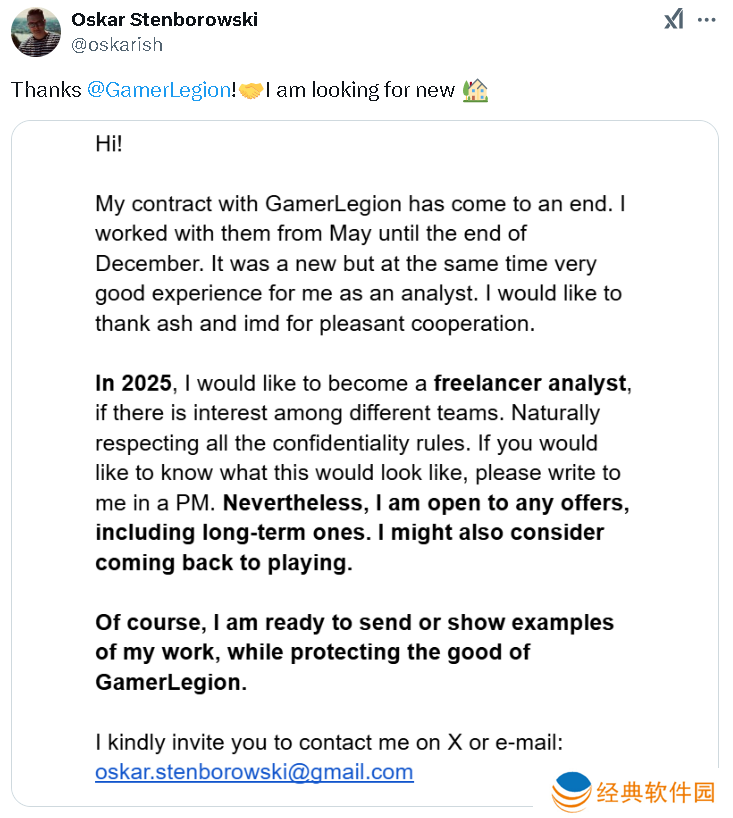 您好!我与GamerLegion的合同已结束,我从5月工作到12月底。作为一名分析师,这段经历对我来说既是新的挑战,也是非常好的体验。我想感谢ash和imd的协作。2025年,我希望能继续担任分析师,如果有哪个团队对此感兴趣,我自然会遵守所有保密规则。我对任何报价都持开放态度,包括长期合作的机会。我也可能考虑重返职业选手的行列。当然,我随时准备向您展示我的工作示例,同时会保护GamerLegion的利益。