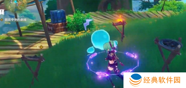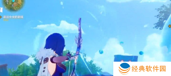 2、第一个水灵就在宝箱的左侧,在空中有三个史莱姆,我们使用弓箭射击,击中后就会出现第一个水灵;
