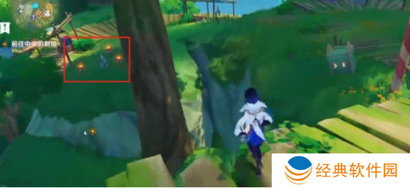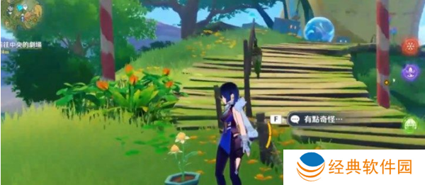 3、第二个水灵在下面,我们顺着木桥下来,在路边有一朵有花盆的甜甜花,靠近后选择“有点奇怪”即可找到第二只水灵;