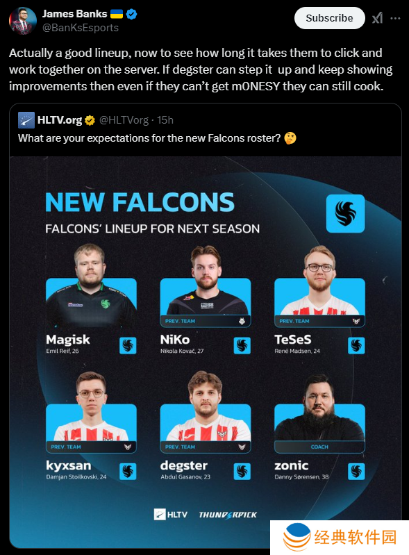 Falcons签下kyxsan、degster和TeSeS三名选手补全阵容后,知名解说BanKs在个人社交媒体账号上分享了自己对该阵容的看法。
