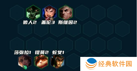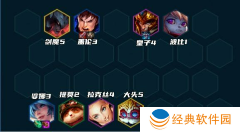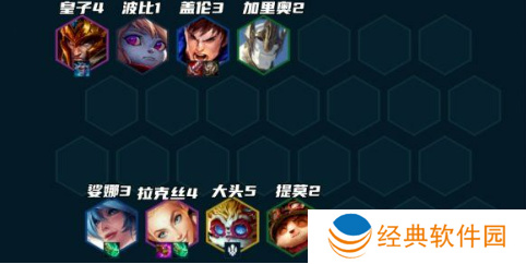 无转职情况下,同样拉7再D牌。7人口找2星盖伦+皇子+拉克丝,开5德玛+3约德尔羁绊,然后卡50利息上8人口。