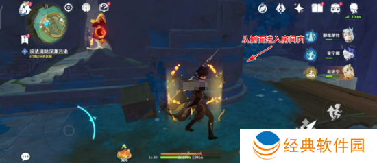 1、首先前往下图位置,然后从箭头指向的位置进入房间。