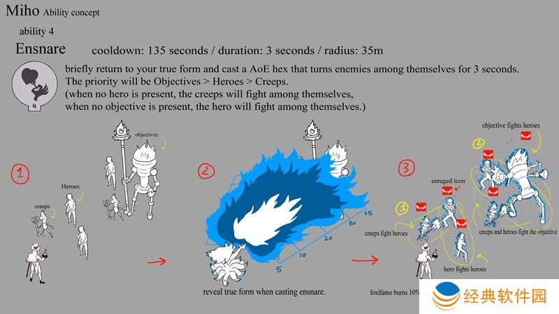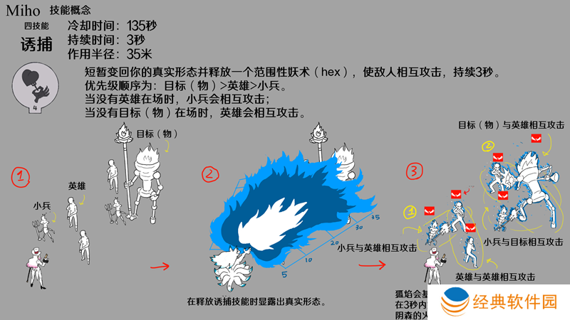 四技能“诱捕”不仅会灼烧敌人,使其损失最大生命值的10%,还会迫使敌人在短时间内自相残杀。这个技能在团战中能充分发挥其潜力,因为每一秒的情况变化都可能导致己方队伍团灭或是敌方队伍被灭。