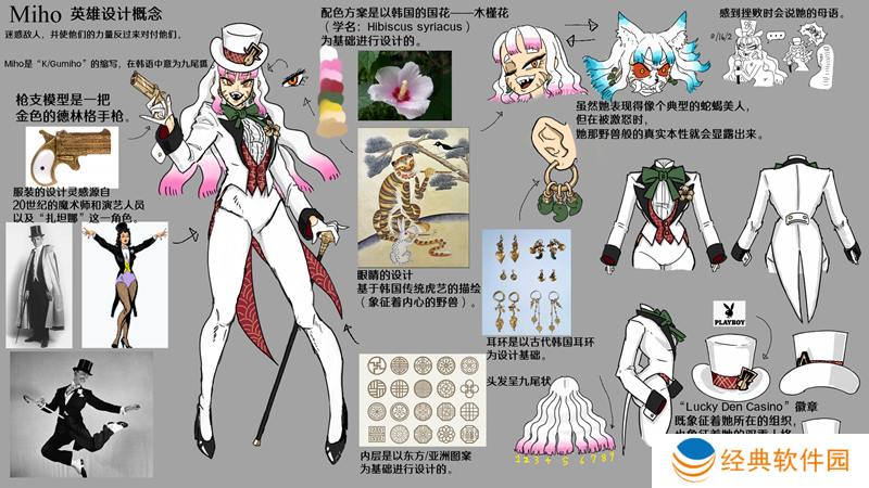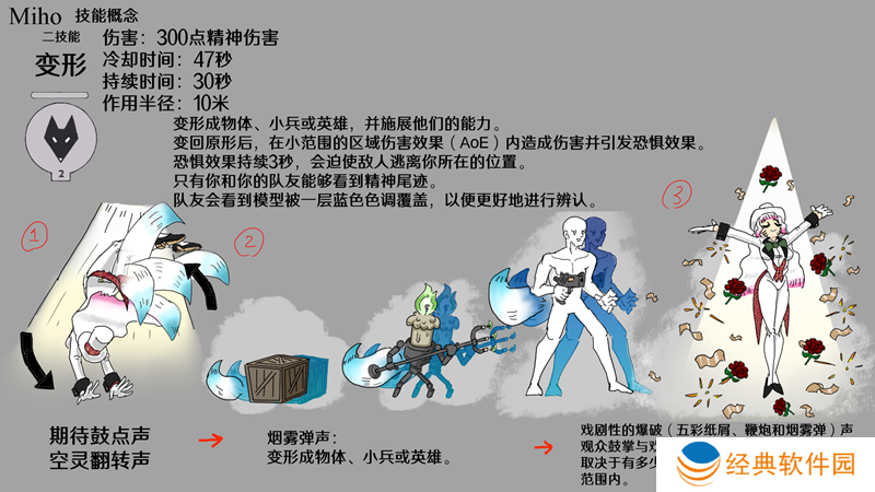 因为这个角色是基于魔术师和艺人,我认为英雄在四处走动时有表演技巧是最重要的。