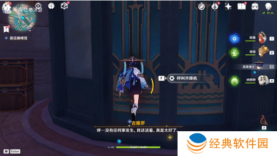 3、看完剧情之后到达一个升降机的门口,需要先完成对话,然后乘坐这个升降机到一层;