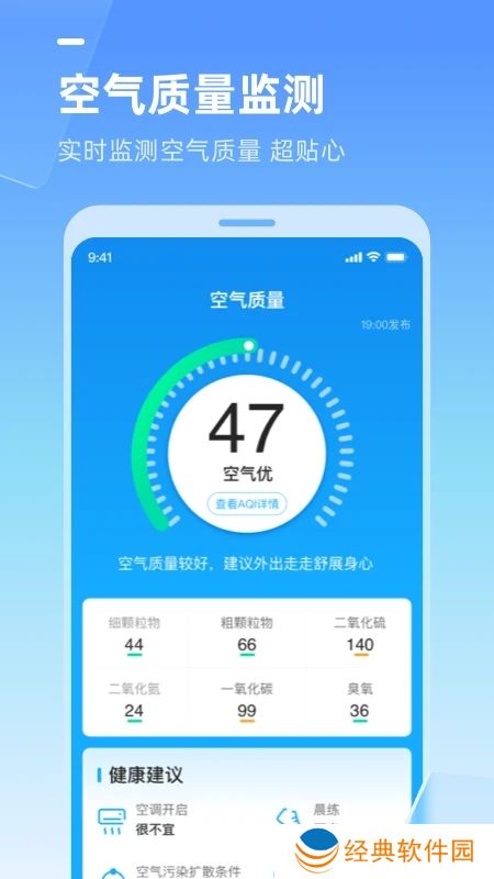 2. 支持丰富的功能模块,包括空气质量、风力、日出日落时间等;