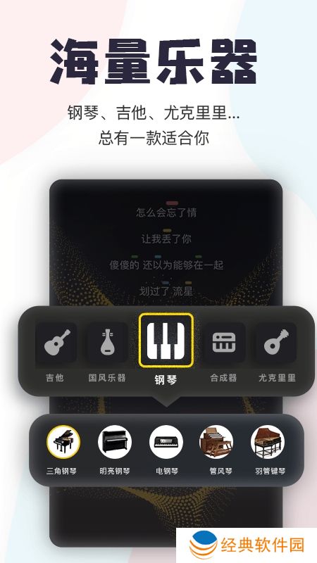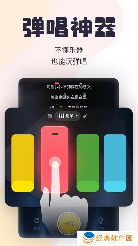 提供钢琴、吉他2种乐器弹唱。按键提示,每个音符对应的按键都会在歌曲上提示,让包你一眼就学会弹奏,不懂乐器也能自弹自唱,是你的随身库乐队喔。