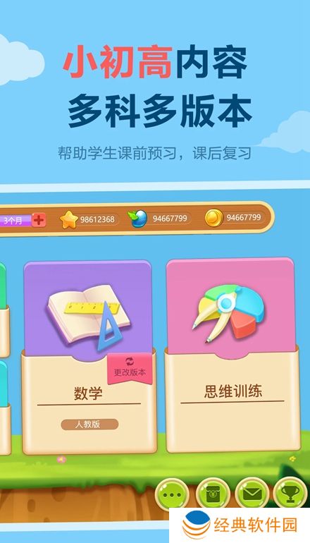 软件特色:内容覆盖:1-6年级语数英三大主科;语文辅导(初级中级高级);经典故事;口语大全等。