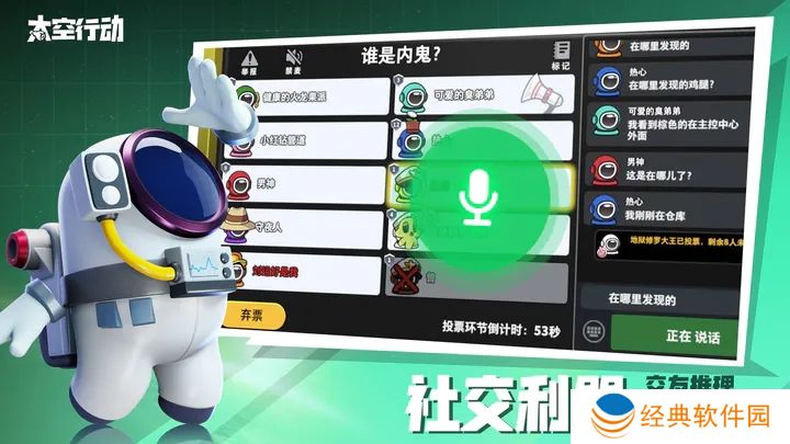 《太空行动》是一款令人兴奋的太空冒险游戏,在这个游戏中,玩家将扮演一名宇航员,探索宇宙深处的神秘星球和未知星系。游戏的主要目标是解开隐藏在宇宙中的谜题,并获得珍贵的资源和技术来提升自己的飞船和装备。里面会有超多活动都可以让你去参与,而你的风采也将完全展现,角色们的立绘形象非常新奇,且整个画面质感也极佳。同时,游戏能够带给你更清晰的实时语音,让玩家更好的和队友交流,将最终的坏人给找出来。