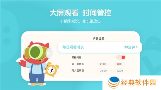 家长可根据孩子的特点,合理限定每日观看时长及禁播时段,超时后自动切换音频收听模式。