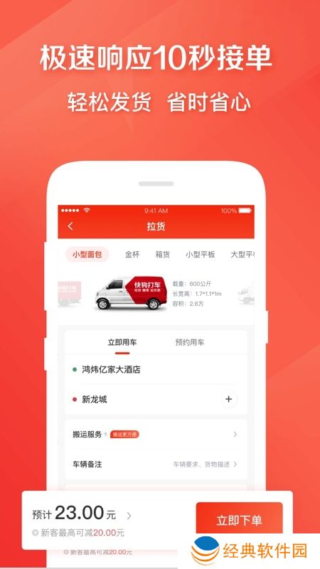 快狗打车·拉货拥有小型面包、金杯、箱货、小型平板车、大型平板车、冷藏箱货等10种车型,满足了B端货主和C端个人用户不同的货运需求。