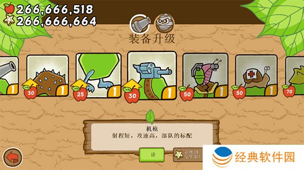 3、大炮:大炮的威力就是机枪无法比拟的了,不过攻击频率有所下降,同时还需要负担更多的树叶值来消耗。是中后期财力比拼的要点
