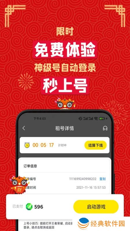 3.价格实惠:相比购买游戏账号,租用游戏账号更经济实惠。软件提供合理的定价策略,让玩家以较低的成本尽享游戏的乐趣。