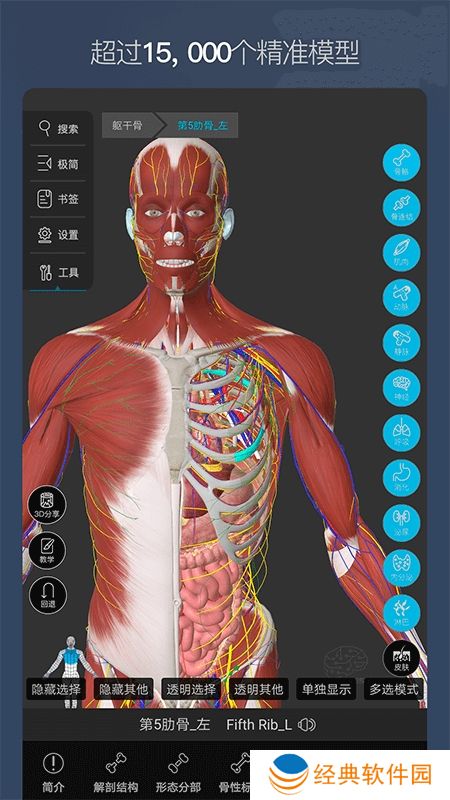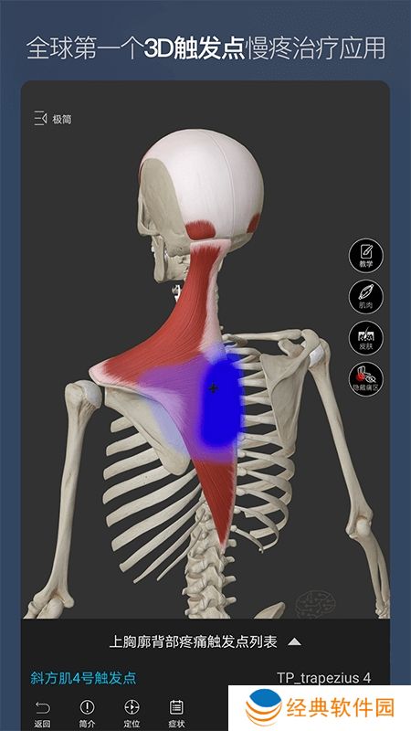 2、丰富细致的解剖内容:整体人,局部结构,骨学结构,骨性标志,肌肉起止点,功能动画,神经支配,血液供应,触诊,触发点等。