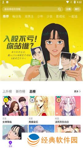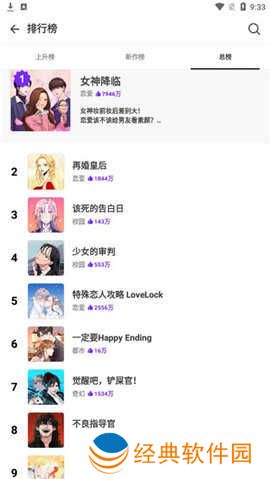5、点击排行榜,有上升榜、新作榜、总榜供大家选择,不知道看什么漫画的时候可以选择这里的哦。