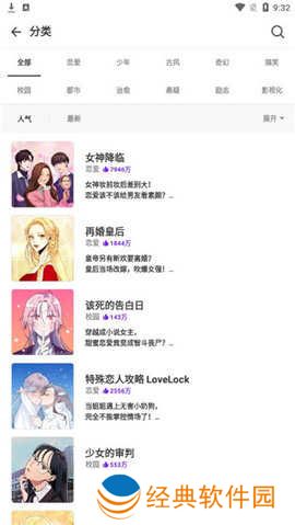 2、点击分类,不管你是想看恋爱、少年、古风、奇幻、搞笑还是校园都市、治愈、悬疑、励志、影视化等这里通通都有;