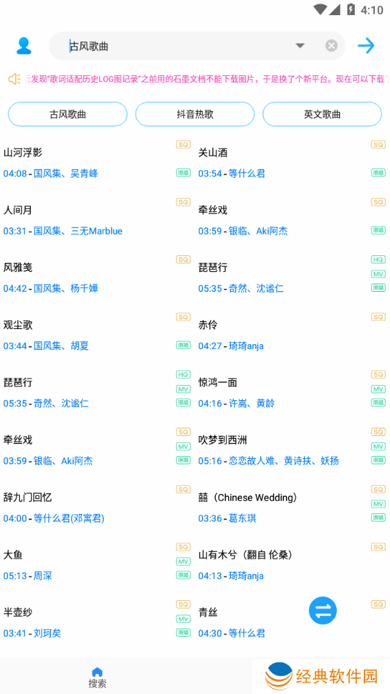 3、可以通过关键字快速搜索,它也有抖音和一些流行音乐类别。