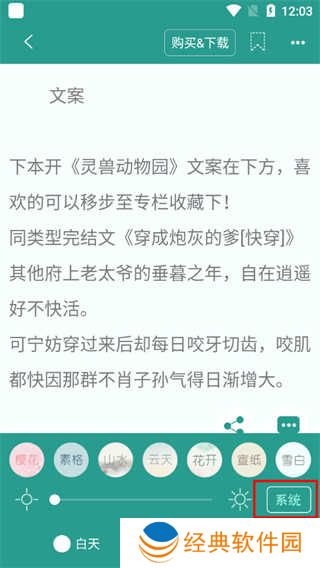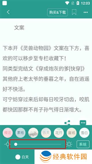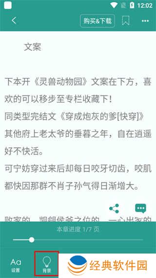 这个问题问偶就对啦,阅读页点击章节内容的中间部分,点击下方的灯泡图标,在此页面可调整页面亮度、背景颜色、切换夜间模式,其中Android版本提供亮度跟随系统以及背景字体颜色的自定义设置,其中默认的配色为水绿。