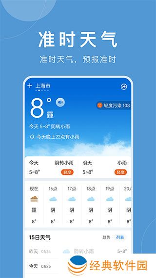 准时天气软件将带给用户最棒的服务,在这个软件里用户可以快速的查询到当天天气,没有收费的项目,可以查询到未来十五天的天气情况,可以详细的了解信息,还会实时进行检测,使用起来很是不错,感兴趣的用户可以下载试一试。