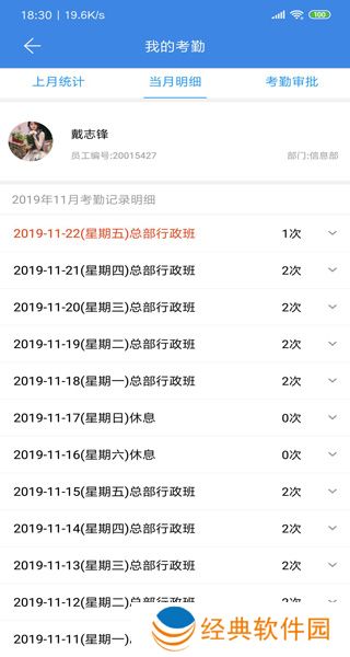 3、多样化的考勤数据记录,包括上月、当月、上周和其他时间段的考勤数据信息。