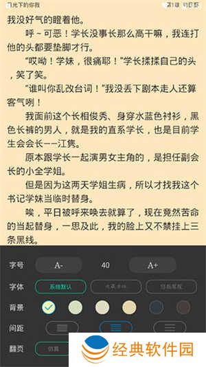4、同时为便于用户阅读,你还可以自己搭配调整选择字体、背景、间距和翻页模式。