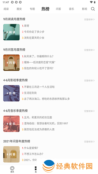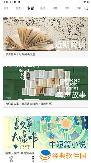 3、点击发现栏,可以查阅各个专栏,包括阅读、图文、专题、热搜榜、问答、音乐和影视等。