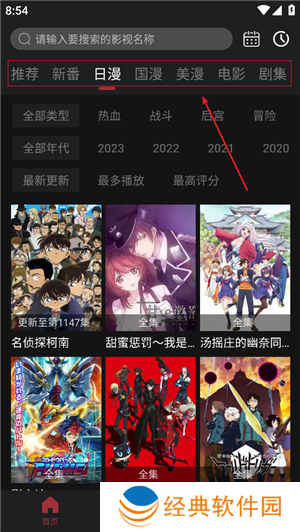 1、软件包含很多种类的视频,有智能推荐、新番、日漫、国漫、美漫、电影、剧集等。选择对应的分类之后还可以选择类型和年代等,快速查找想看的视频。