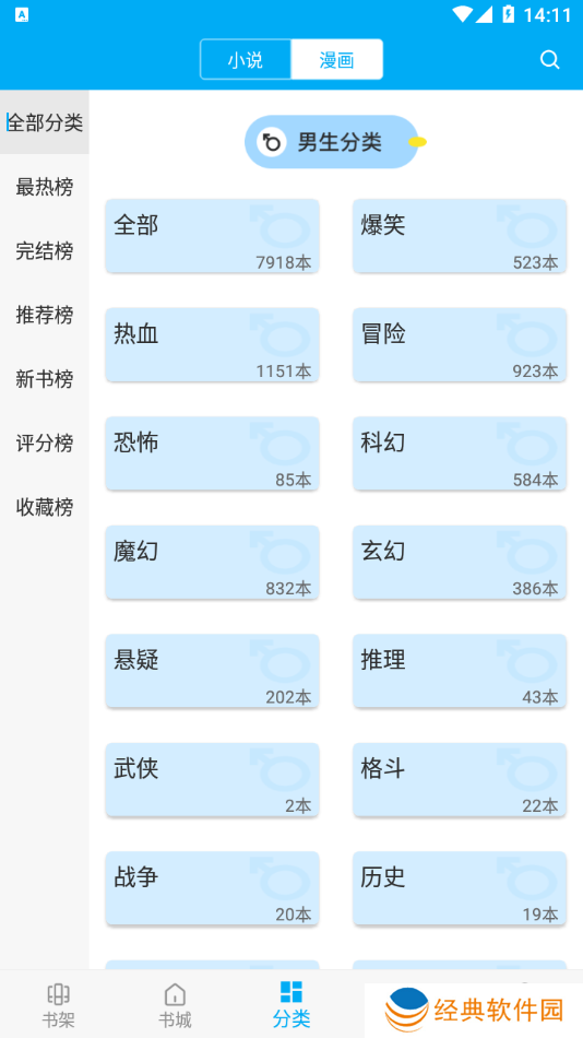 内置小说和漫画两大板块,还有各种排行榜和分类,搜索时可以切换小说和漫画,非常方便