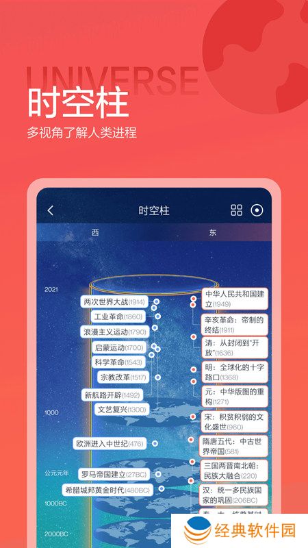 从宇宙大爆炸到地球形成,从生命起源到现代文明,全历史app只需一条时间轴让您轻松了解全历史发展。