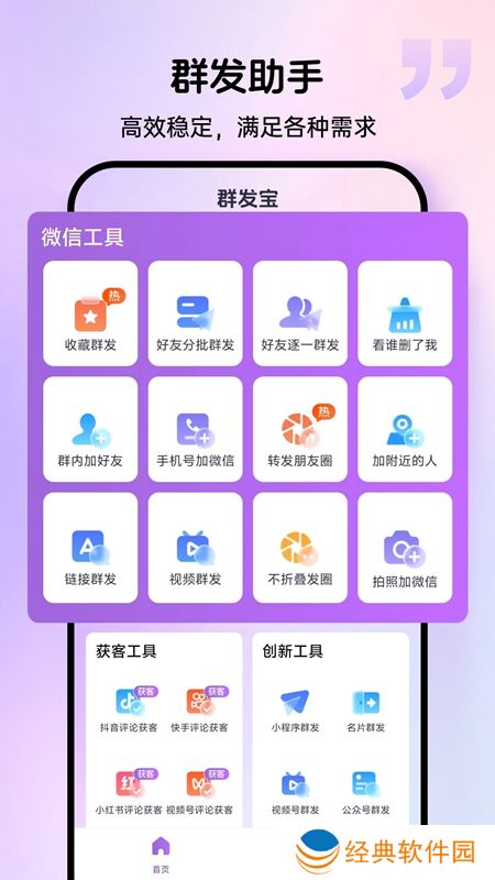 群发宝APP官方最新版是一款功能强大的微信营销软件,专为企业、商家及个人用户设计。它集成了一键群发、拓客助手、微信好友清理、朋友圈内容转发等多种功能,旨在帮助用户通过微信平台进行高效的市场推广和客户管理!