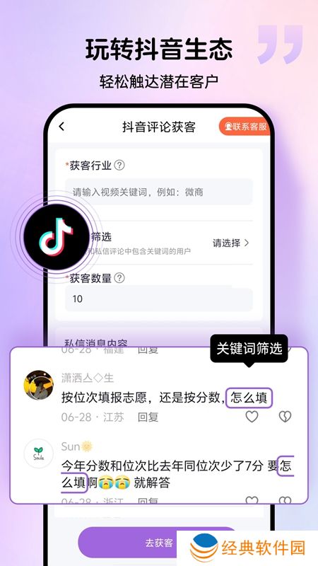 软件特色1.精准获客:通过设置关键词筛选目标行业和互动评论,快速筛选出目标客户,大幅提升营销精准度。