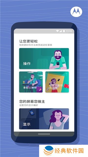 Moto 应用程序是一个吸引人的平台,平台上的所有功能都可让您轻松、舒适地使用摩托罗拉手机。在该应用程序内,您会找到 Moto 操作、Moto 显示和其他功能系列,可让您定制与您的设备进行交互的方式。每次打开 Moto 应用程序时,您将看到有关内部功能的信息,这样您就可以发现充分体验 Moto 功能的新方式。