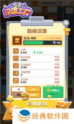 放置汉堡工厂免广告版游戏特色1、放置汉堡工厂免广告版游戏采用了放置类玩法,玩家只需简单地点击或拖拽,放置设备、升级工厂和收集资源。