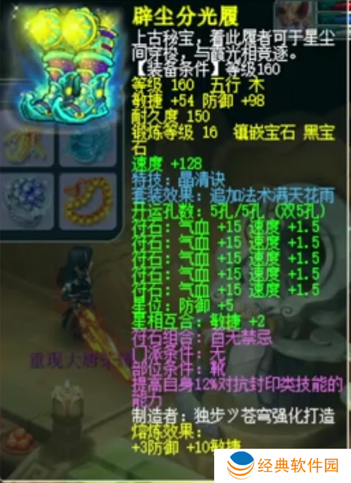 荣耀少侠的鞋子基础防御101,基础敏捷64,镶嵌16锻黑宝石,附带特技晶清诀。