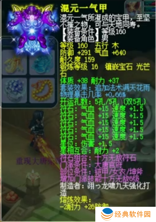 荣耀少侠的衣服基础防御317,双加体质耐力73,镶嵌16锻光芒石,附带特性0.66%物理暴击几率。