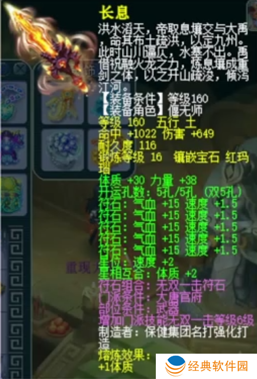 荣耀少侠的武器是一把非专用巨剑,基础命中622,基础伤害649,双加体质力量69,镶嵌16锻红玛瑙。这把武器的综合伤害高达1036,在非专用武器中十分罕见。