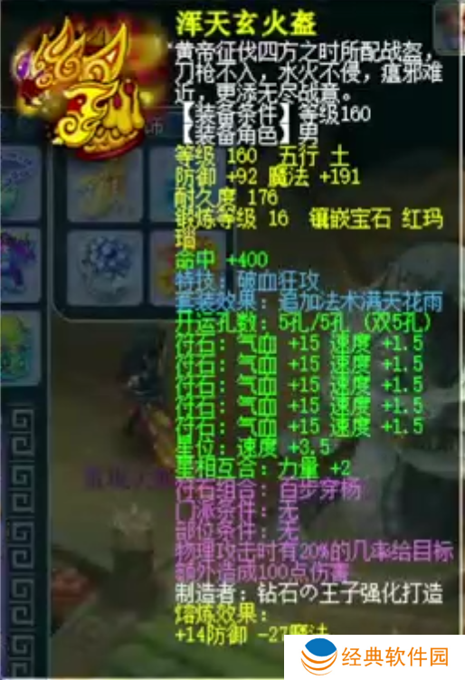 荣耀少侠的帽子基础防御106,镶嵌16锻红玛瑙,附带特技破血狂攻。