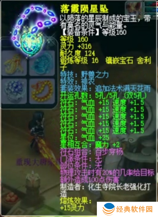 荣耀少侠的项链基础灵力235,镶嵌16锻舍利子,附带特效神农,附带特技野兽之力。