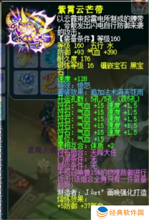 荣耀少侠的腰带基础防御98,基础气血427,镶嵌16锻黑宝石,附带特效愤怒。