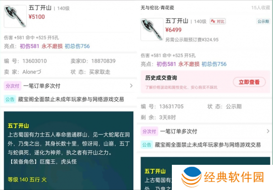 不知道大家有没有遇到过这种在藏宝阁倒手卖货的人,这位玩家收藏的一把武器,在价格为5100块的时候被人买了,没过几天,这把一模一样的武器又出现在藏宝阁上,而且价格变成了6499块,不出意外买家和卖家应该是同一个人。