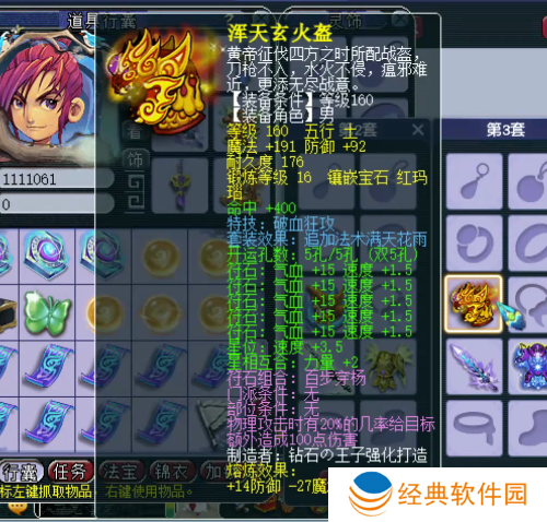 160级破血狂功男头,16锻红玛瑙,熔炼后防御+106。