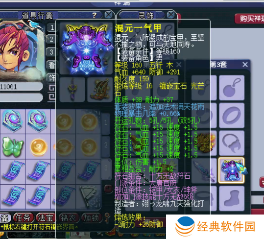 160级高属性男衣,附加物暴几率+0.66%,16锻光芒石,熔炼后防御+317,体质+38,耐力+37。