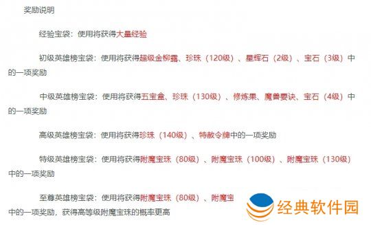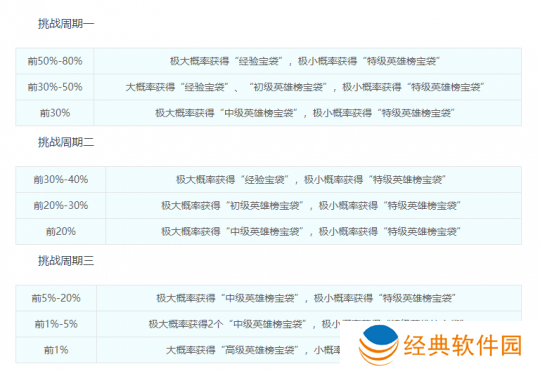 每个周期结束时,排名在一定范围内的玩家都可以获得英雄榜宝袋,排名越靠前,宝袋的奖励越高级。