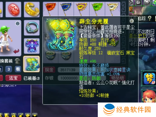 160级不磨鞋子,附加物暴伤害+1.09%,12锻黑宝石,熔炼后防御+98,敏捷+57。