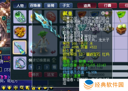 160级不磨武器,附加物暴伤害+4.95%,12锻红玛瑙,总伤820.67,体质+38,敏捷+31。