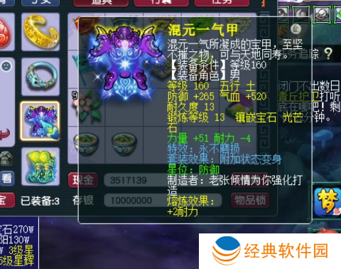 160级不磨男衣,13锻光芒石,熔炼后力量+51,耐力-2。