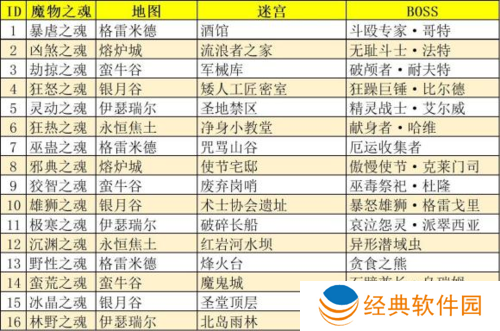 2.表格中的就是需要击杀的boss和对应的魔魂,注意,这个怪都是20年前的,玩家们不要刷错地图了,刷错了地图是不会掉落的