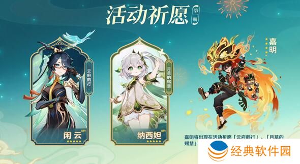 1、第一期活动祈愿:玩家抽取闲云、纳西妲的概率将大幅度提升。