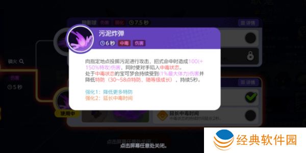 向指定地点投掷污泥进行攻击,招式命中时造成100(+150%特攻)伤害,同时使对手陷入中毒状态。 处于中需状态的宝可梦会持续受到(1%最大体力)伤害井降低特防(30~58点特防,随等级成长),持续5秒。