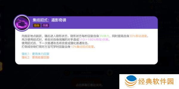 向指定地点跳跃,随后进入隐形状态。隐形状态每秒回复自身3%体力,同时提高自身30%移动速度。再次使用招式时,将会对自身周围的对手造成510(+180%6特攻)伤害。
